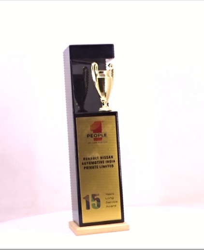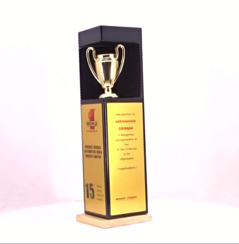 Featuring a central 3D metal cup and contrasting wooden base, this strong vertical design celebrates long service, performance, or legacy. Offers UV or sublimation branding across three visible sides.